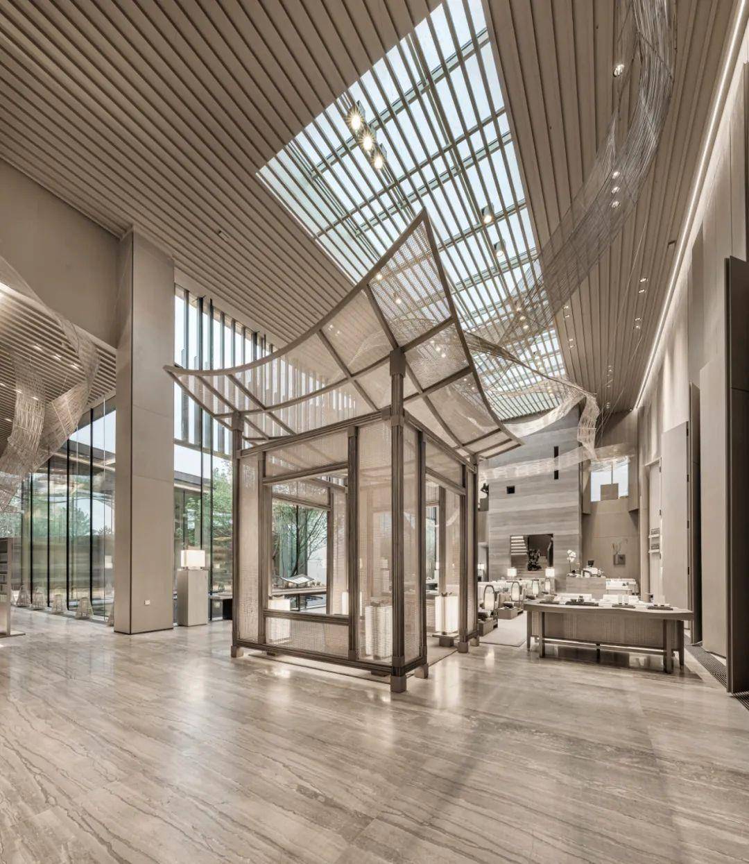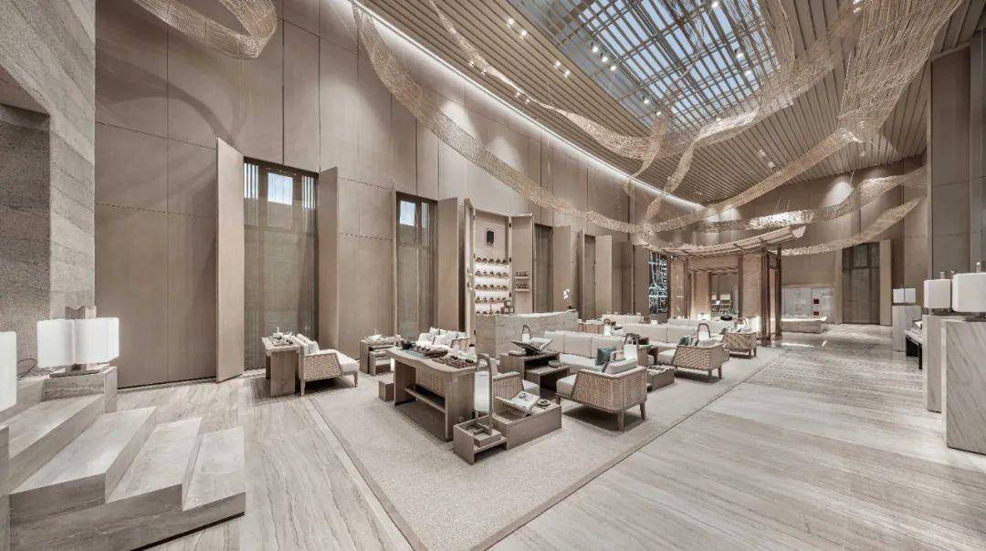 室内是精致的禅境体验空间,设计团队了解竹子的质感、柔韧度、耐久度等,采用四川当地的一项非物质文化遗产“道明竹编”,以竹条手工精心编织而成“清风”的形态,贯穿整个室内的高处,充满了柔性之美,也表达出对于古老手工艺文化的传承。